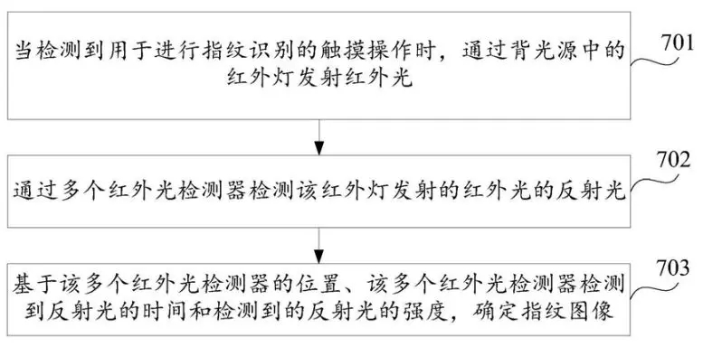 最后,根據(jù)多個(gè)紅外光檢測器的位置、多個(gè)紅外光檢測器檢測到反射光的時(shí)間和檢測到的反射光的強(qiáng)度,確定指紋圖像。