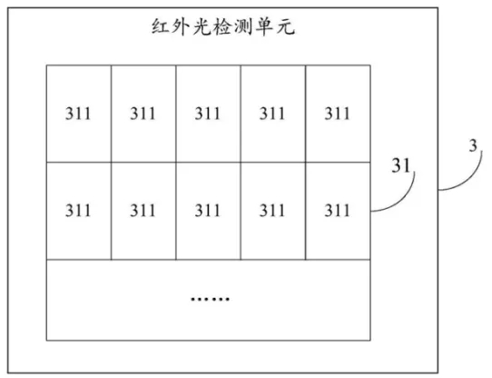 如上圖為LCD面板的結(jié)構(gòu)示意圖,該LCD面板包括背光源1、CF層2和紅外光檢測單元3,如下圖(左上)所示,背光源還包括用于發(fā)射紅外光的紅外燈11,如下圖(右上)所示,CF層包括多個(gè)濾光片21,圖下圖(正下)所示,紅外光檢測單元包括紅外光檢測陣列31,紅外光檢測陣列包括多個(gè)紅外光檢測器311,這些檢測器就是用于檢測紅外光的。